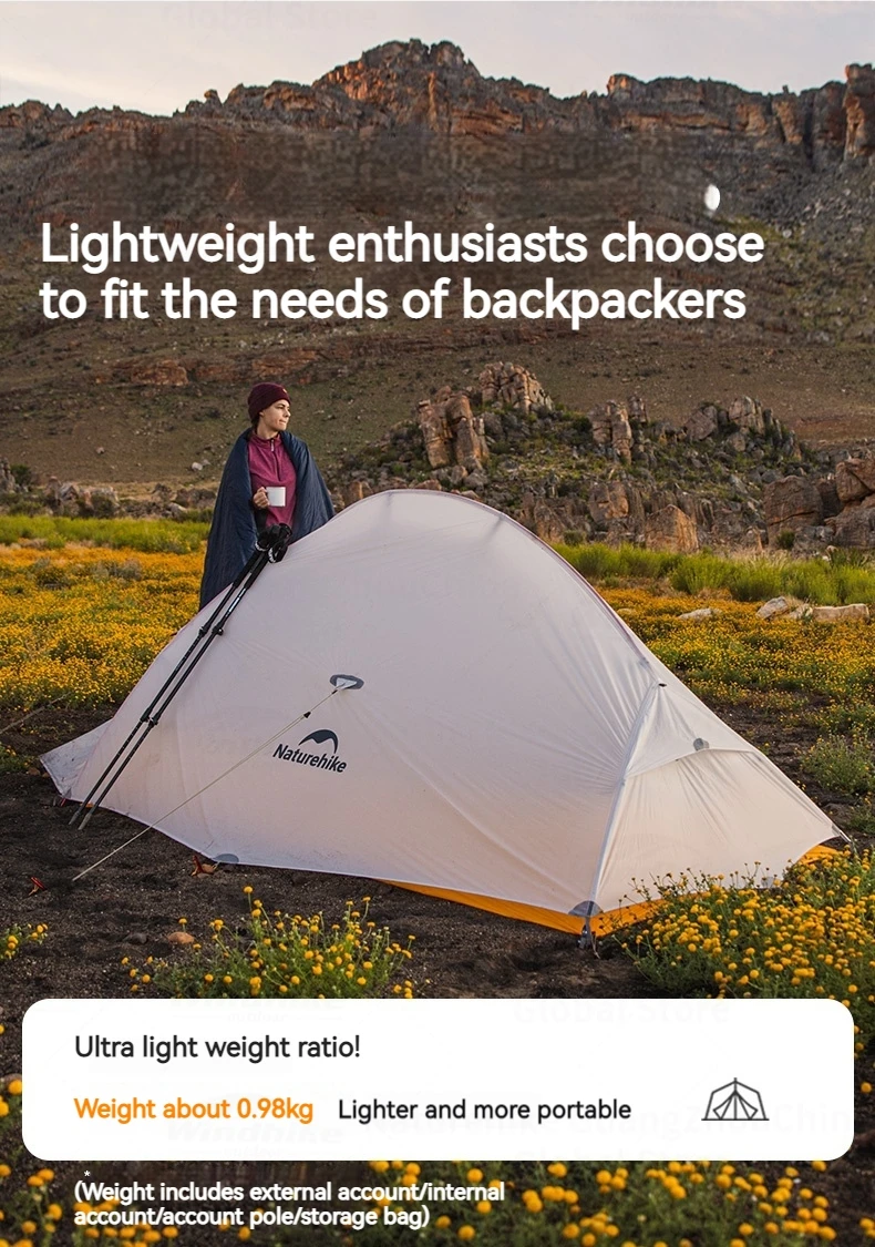 네이처하이크 클라우드 업 2 텐트 10D 나일론 방수 더블 레이어 휴대용 1-2인 하이킹 캠핑 텐트 초경량 980g 매트 포함